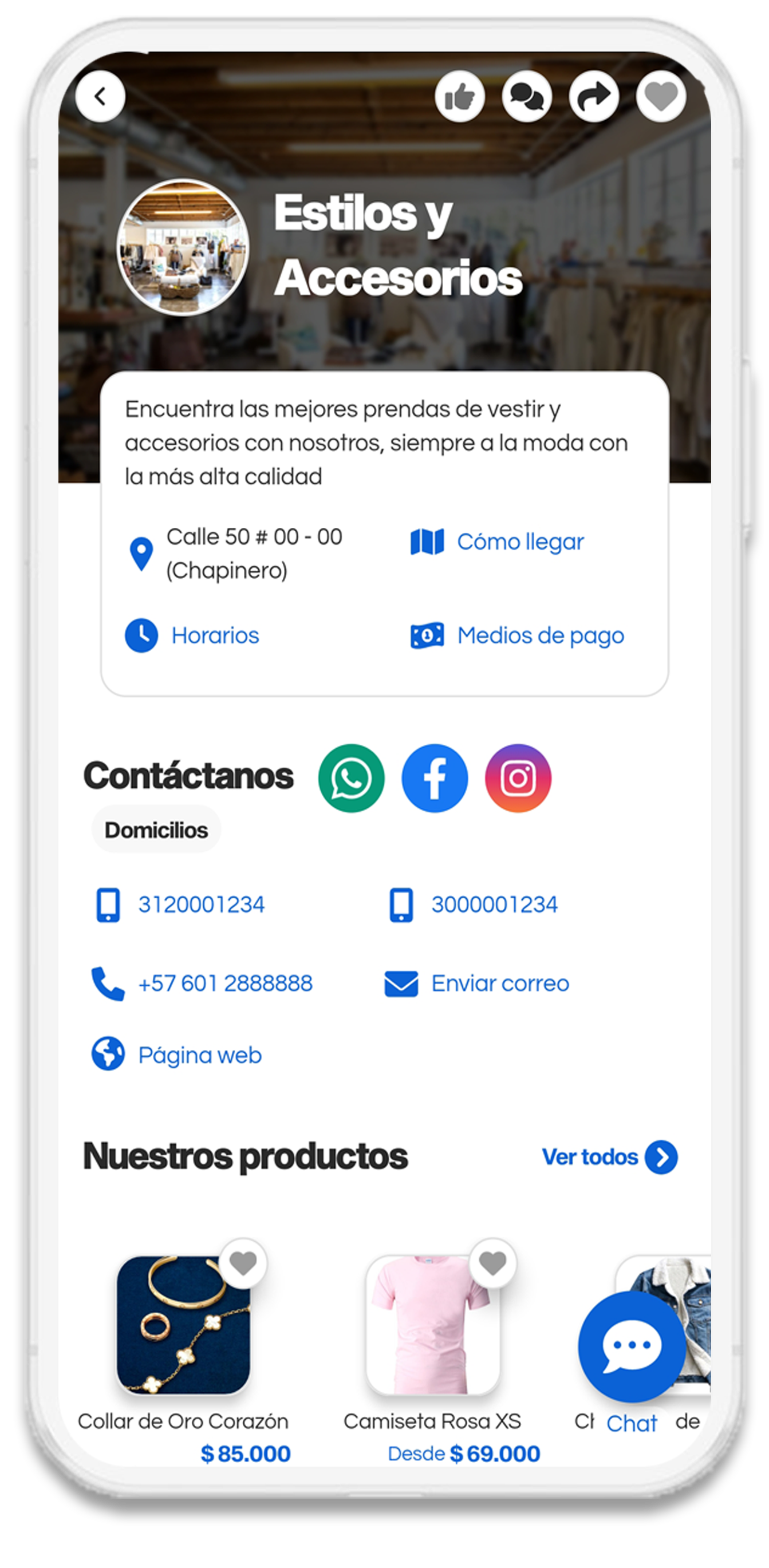 Comunícate con tus clientes a través de un chat propio que estará habilitado en tu comercio. Reflejarás una imagen mucho más profesional de tu sitio.